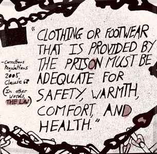 People Against Prisons Aotearoa demand that Corrections provide the basic supplies it is required to by law to all prisoners. Clause 68(5b) of the Corrections Regulations (2005) requires - that "Clothing or footwear is provided by the prison must be adequate for safety, warmth, comfort, and health."